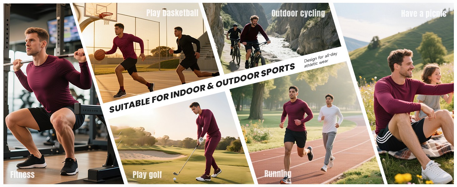 Men's compression shirts are suitable for all sports indoors and outdoors, such as Fitness, playing basketball, playing golf, cyclying, running, camping, etc.